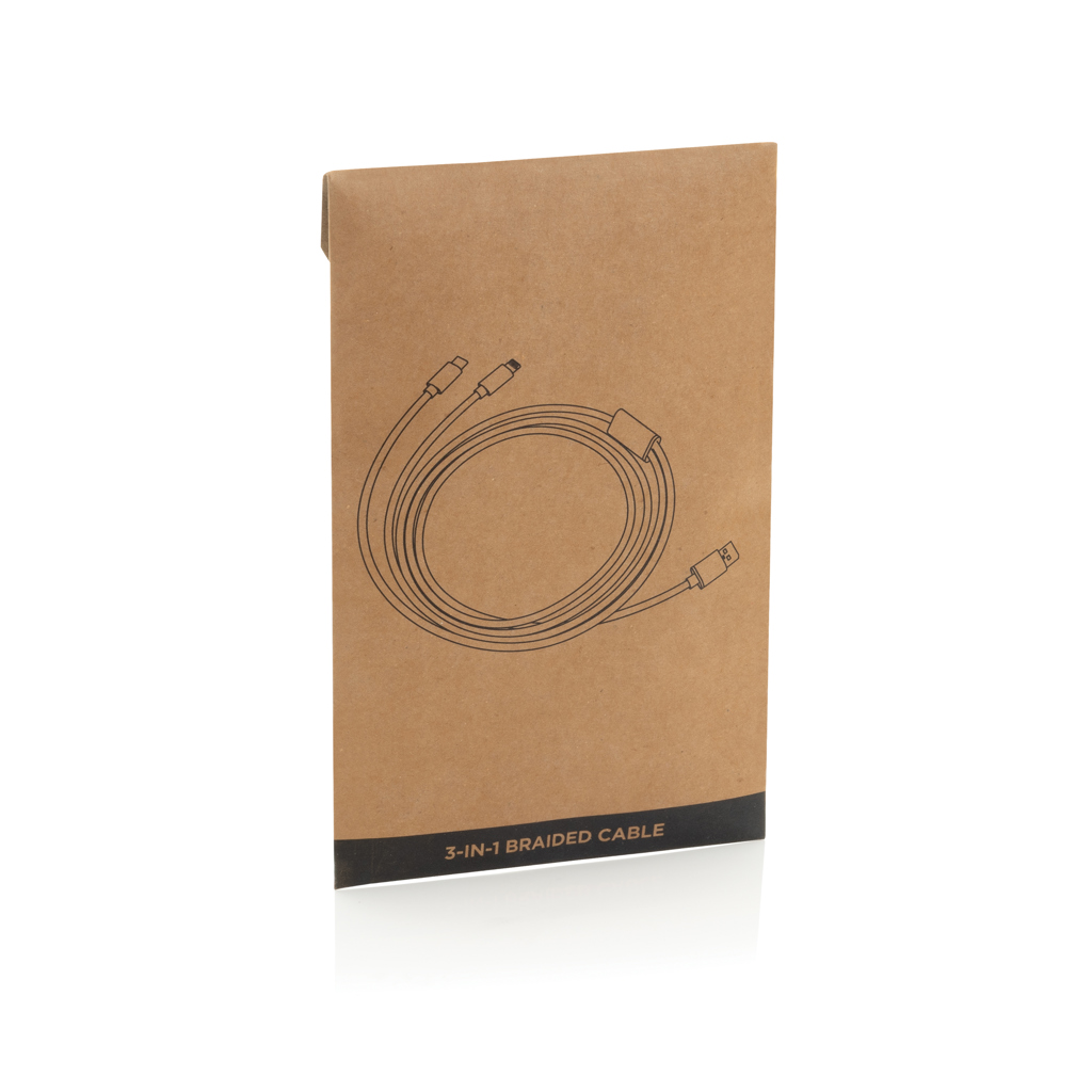 - Luxury braided 3 in 1 cable with type C and double-sided connector for iOS and Android devices that require micro USB.
