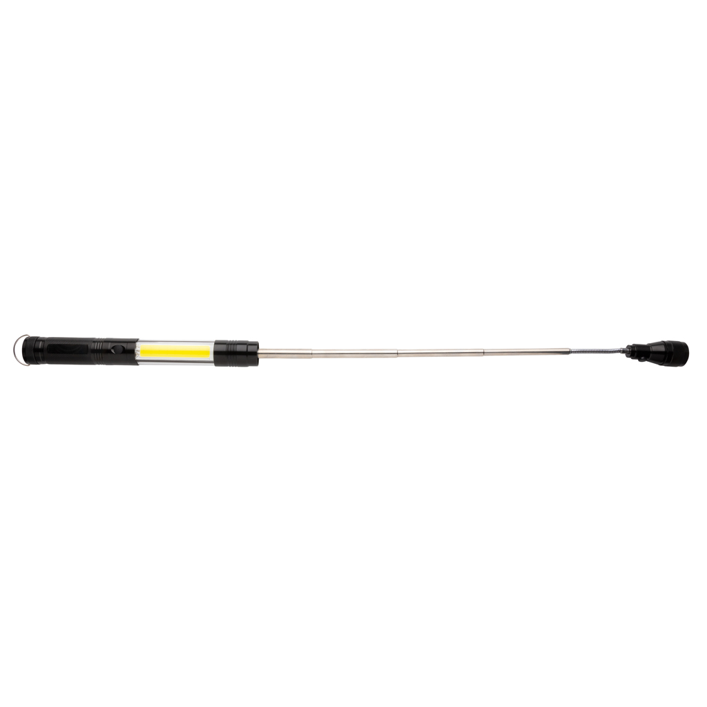 - This aluminium flashlight allows you to extend from its normal size of 26 cm to 64 cm allowing you to pick up items that are stuck in hard to see and reach places with the magnet on front.