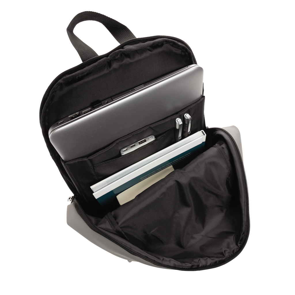 - This minimalist, modern backpack made of smooth PU is fully lined and features an inner 15.6 inch laptop compartment, a spacious main compartment and 2 inner pockets and 2 pen loops.