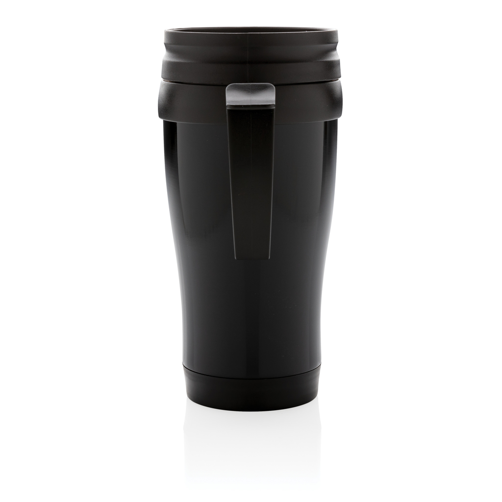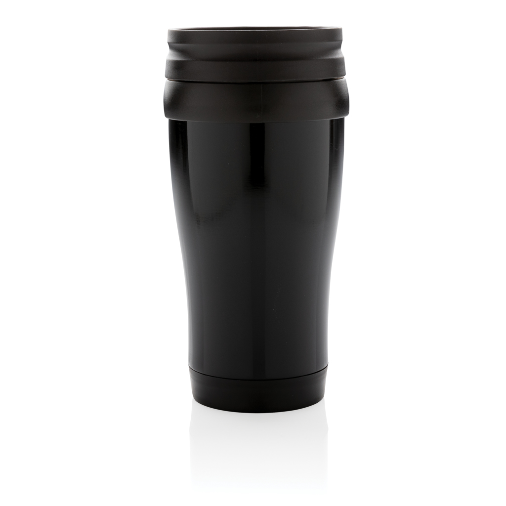 - 350ml stainless steel outside and PP inside mug with lid and base in black..