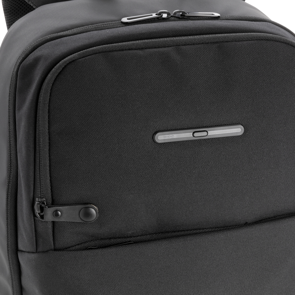 • This unique Swiss Peak laptop backpack with UV-C sterilising pocket features a minimalistic design and has an integrated UV-C sterilising external front pocket, killing up to 99,9% of the bacteria on items placed inside the pouch.