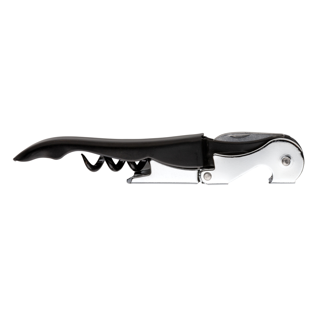 - This waiters corkscrew is a classic corkscrew design that has a foil cutter blade, a two stage cork lifter and bottle opener.
